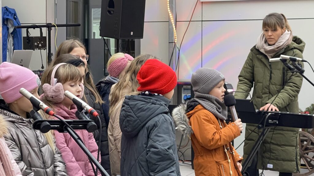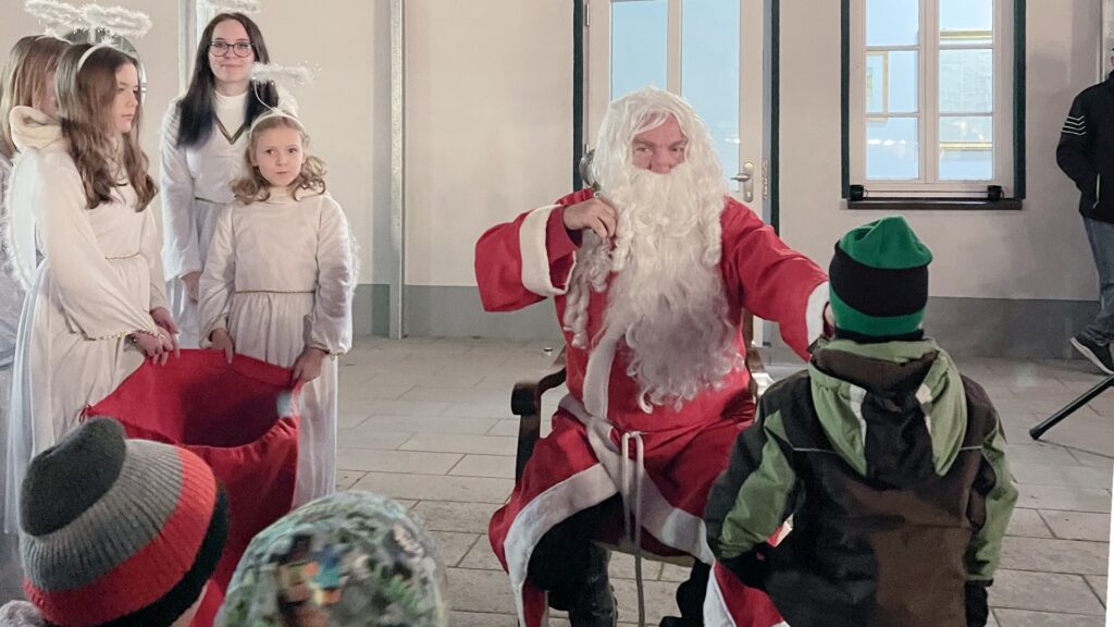 Natürlich durfte der wichtigste Gast nicht fehlen: Der Weihnachtsmann besuchte den Markt in Begleitung seiner Engelchen. Aus dem großen Sack gab es für jedes Kind eine kleine Nascherei – vorausgesetzt, ein Gedicht oder Lied wurde vorgetragen, was die Kinder mit Bravour meisterten.